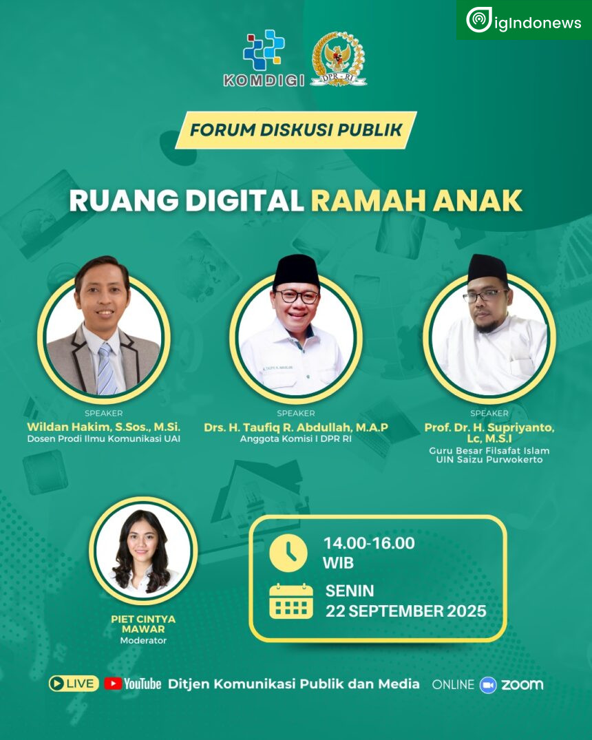 Digindonews.com-Dalam Webinar “Ruang Digital Ramah Anak” yang diselenggarakan secara daring pada Senin, 22 September 2025, dua narasumber, yakni Wildan Hakim, S.Sos., M.Si (Dosen Ilmu Komunikasi UAI) dan Prof. Dr. H. Supriyanto, Lc, M.S.I (Guru Besar Filsafat Islam UIN Saizu Purwokerto), menyoroti berbagai ancaman dunia digital terhadap anak-anak serta pentingnya pendidikan dan pengawasan.