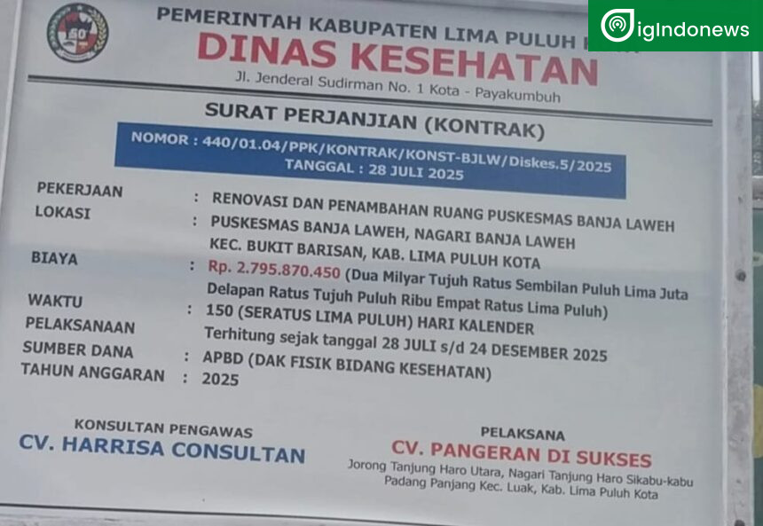 Limapuluh Kota, Digindonews.com – Ptoyek mangkrak di Dinas Kesehatan Lima Puluh Kota sering kali di salahkan masalah dana. Namun, proyek dengan anggaran Rp2.795.870.450 yang dikerjakan oleh CV Pangeran Di Sukses sebagai pelaksana dan CV Harrisa Consultan sebagai konsultan pengawas justru terhenti, pemicu utama adalah drama internal dan manajemen yang buruk.