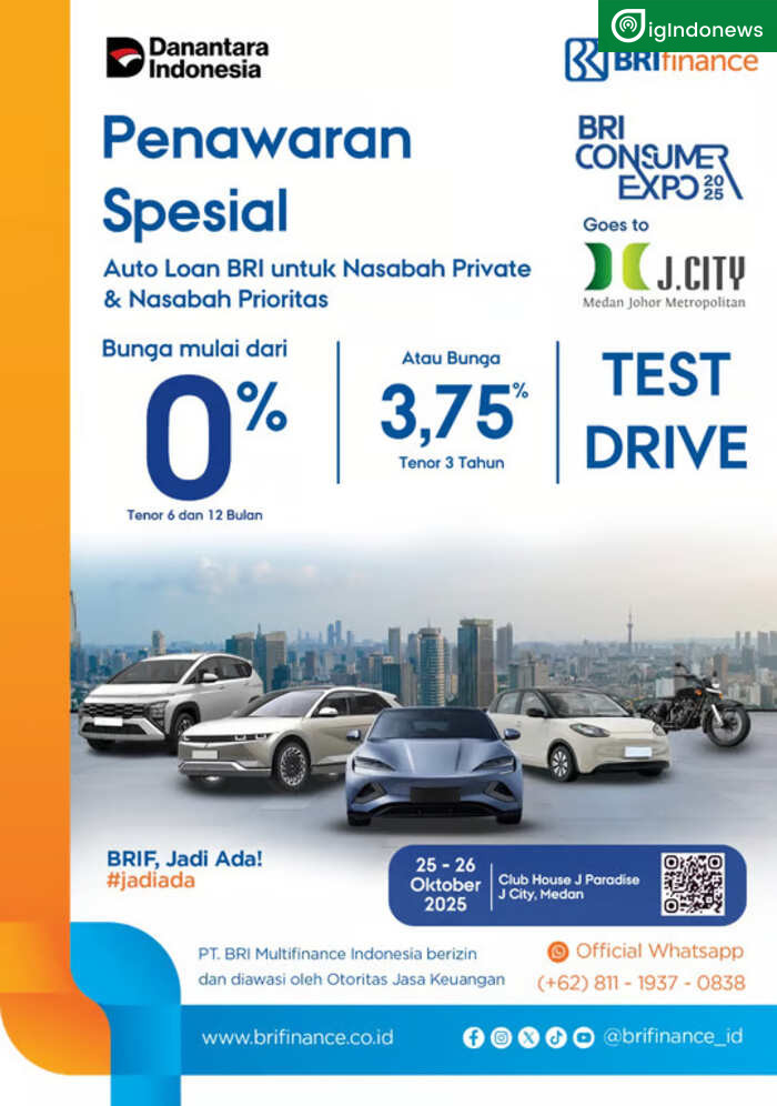 Dalam kesempatan ini, BRI Finance menawarkan program Auto Loan BRI dengan suku bunga spesial, yakni 0% untuk tenor 6 dan 12 bulan, atau 3,75% untuk tenor 3 tahun. Selain kemudahan pembiayaan, pengunjung juga dapat mengikuti test drive berbagai kendaraan unggulan dari merek otomotif terkemuka, sambil berkonsultasi langsung mengenai proses pengajuan dan skema pembiayaan yang paling sesuai dengan kebutuhan mereka.