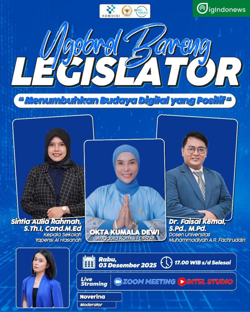 DigIndonews.com, Jakarta – Webinar Ngobrol Bareng Legislator bertema “Menumbuhkan Budaya Digital yang Positif” pada Rabu (3/12) menghadirkan tiga narasumber yang menyoroti pentingnya etika, keamanan, dan literasi digital di tengah pesatnya digitalisasi di Indonesia.