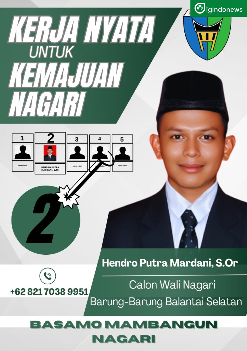 DIGINDONEWS-Hendro Putra Madani salah satu kader PC GP Ansor Pesisir Selatan turut maju dan meramaikan pemilihan Wali Nagari (Pilwana) tahun 2025. Ia berkomitmen memajukan Nagari Barung Barung Belantai Selatan dengan modal kemampunan dan pengalaman organisasi.