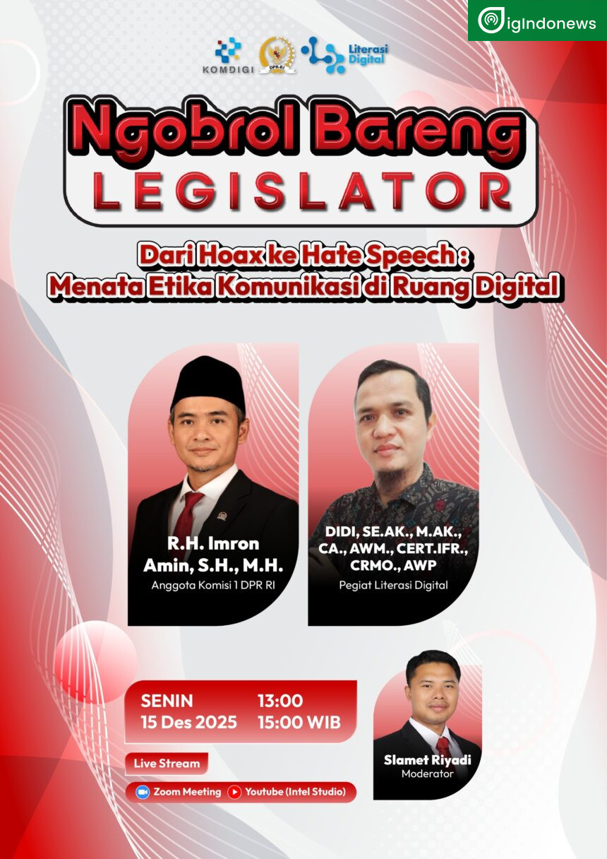 DigIndonews.com, Jakarta – Arus informasi di ruang digital yang semakin deras membawa tantangan besar bagi masyarakat Indonesia. Di tengah kemudahan mengakses dan membagikan informasi, hoaks dan ujaran kebencian masih kerap beredar dan berpotensi memecah belah kehidupan sosial. Kondisi tersebut menjadi perhatian dalam kegiatan Ngobrol Bareng Legislator bertema “Dari Hoax ke Hate Speech: Menata Etika Komunikasi di Ruang Digital” yang digelar pada Senin, 15 Desember 2025.