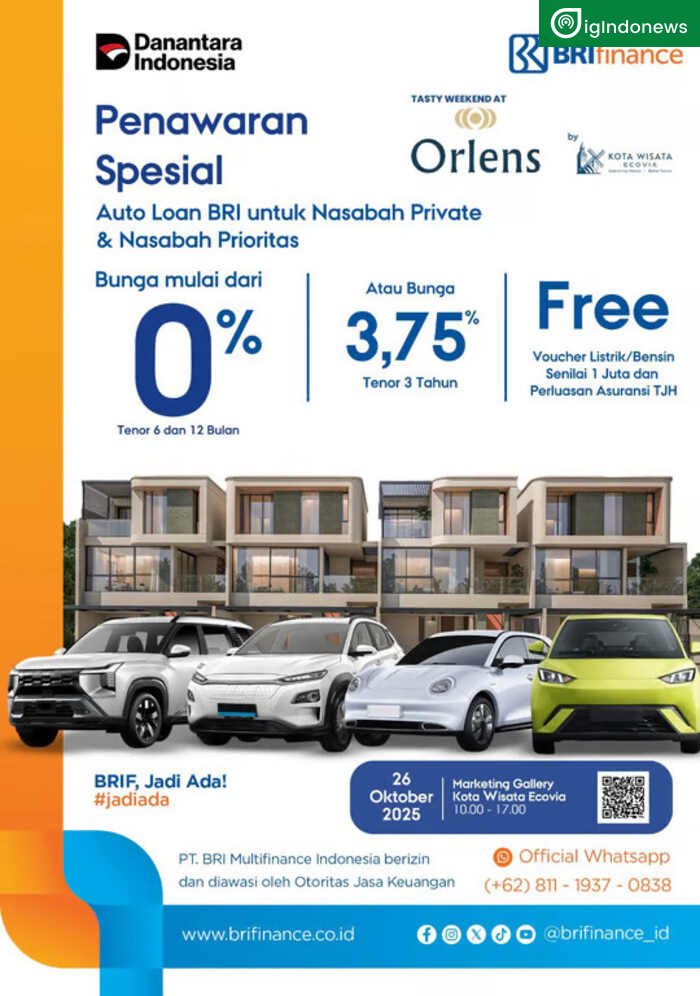 Digindonews.com – PT BRI Multifinance Indonesia (“BRI Finance”), anak perusahaan BRI Group yang bergerak di bidang pembiayaan, terus menunjukkan komitmennya dalam memberikan kemudahan bagi nasabah untuk memiliki kendaraan impian. Melalui program Auto Loan BRI yang ditujukan bagi Nasabah Private dan Nasabah Prioritas, BRI Finance menghadirkan penawaran bunga kompetitif dengan proses pembiayaan yang semakin mudah dan efisien. Program ini diperkenalkan dalam kegiatan Tasty Weekend at Orlens yang berlangsung di Marketing Gallery Kota Wisata Ecovia, Cibubur, pada Minggu, 26 Oktober 2025.