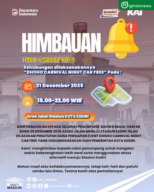 Digindonews.com – PT Kereta Api Indonesia (Persero) Daerah Operasi 7 Madiun mengimbau para pelanggan kereta api yang akan berangkat dari Stasiun Kediri pada Rabu malam, 31 Desember 2025, untuk datang lebih awal ke stasiun, minimal 1 (satu) jam sebelum jadwal keberangkatan kereta api.