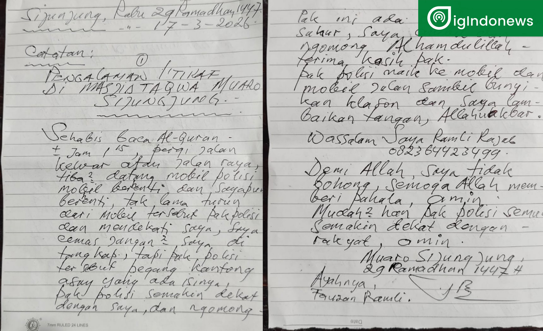 Dalam surat tersebut, Fauzan menceritakan pengalamannya saat melaksanakan ibadah iktikaf di Masjid Taqwa Muaro Sijunjung sekitar pukul 01.15 WIB. Usai membaca Al-Qur’an, ia bertemu dengan personel kepolisian yang sedang bertugas. Dengan sikap humanis, petugas menyapa dan memberikan makanan sahur kepadanya.