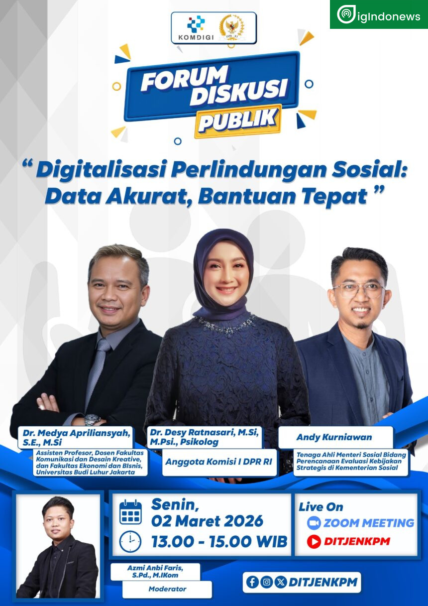 Digindonews.com, Jakarta, 2 Maret 2026 — Transformasi digital dalam sistem perlindungan sosial membutuhkan integrasi data nasional yang kuat agar kebijakan bantuan pemerintah dapat berjalan efektif, akurat, dan berkelanjutan. Hal tersebut menjadi sorotan utama dalam Forum Diskusi Publik bertema “Digitalisasi Perlindungan Sosial: Data Akurat, Bantuan Tepat” yang diselenggarakan pada Senin (2/3).