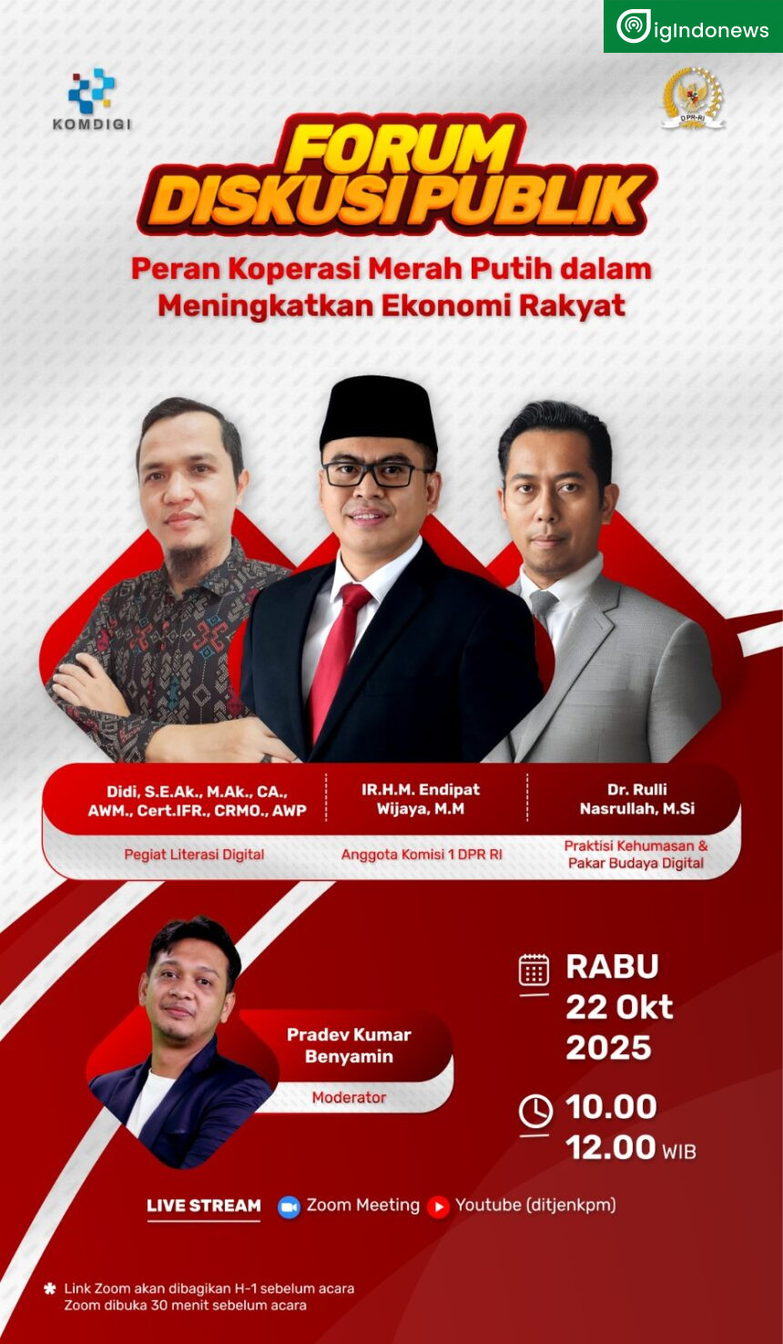 Digindonews.com-Forum Diskusi Publik bertema “Peran Koperasi Merah Putih dalam Meningkatkan Ekonomi Rakyat” diselenggarakan pada Rabu, 22 Oktober 2025, dan menghadirkan Ir. H. M. Endipat Wijaya, M.M., Anggota Komisi I DPR RI, sebagai narasumber utama. Dalam kesempatan tersebut, ia menegaskan pentingnya peran koperasi sebagai kekuatan ekonomi rakyat di era digital dan pasca-pandemi.