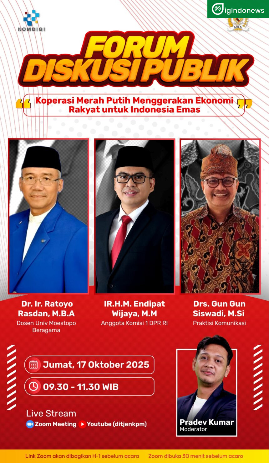 Digindonews.com-Dalam Forum Diskusi Publik bertajuk “Koperasi Merah Putih Menggerakkan Ekonomi Rakyat untuk Indonesia Emas” yang digelar pada Jumat, 17 Oktober 2025, dua narasumber—Drs. Gun Gun Siswadi, M.Si. (Praktisi Komunikasi) dan Ratoyo Rasdan, M.B.A. (Dosen Universitas Moestopo Beragama)—menyoroti pentingnya aspek komunikasi, transparansi, dan profesionalisme dalam tata kelola koperasi modern.