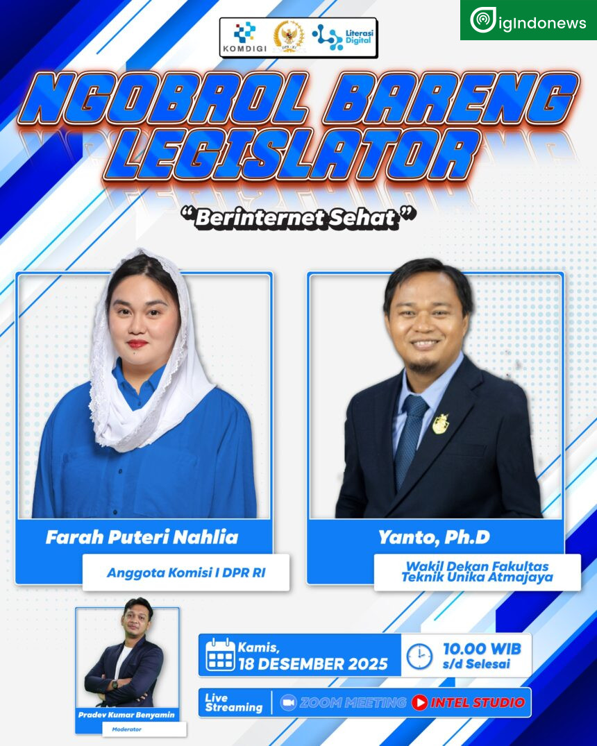 DigIndonews.com, Jakarta — Anggota Komisi I DPR RI Farah Puteri Nahlia mengajak masyarakat untuk menerapkan pola berinternet sehat, aman, dan bertanggung jawab di tengah tingginya penetrasi internet di Indonesia. Ajakan tersebut disampaikan dalam kegiatan Ngobrol Bareng Legislator bertema “Berinternet Sehat” yang digelar secara daring pada Kamis (18/12/2025).
