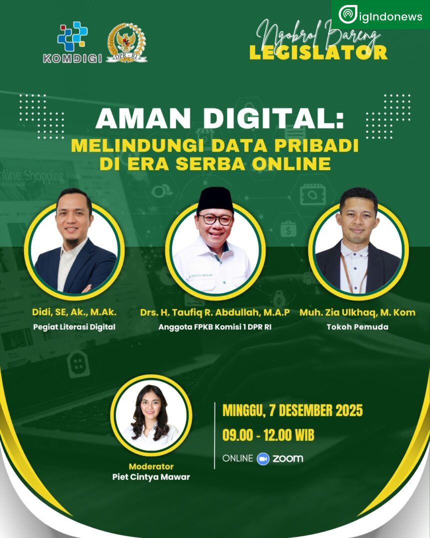 Digindonews.com, Jakarta — 7 Desember 2025. Gelombang kejahatan digital dan kebocoran data menjadi fokus utama dalam webinar literasi digital bertema “Aman Digital: Melindungi Data Pribadi di Era Serba Online” yang digelar Badan Pengembangan SDM Komunikasi dan Digital bersama Anggota Komisi I DPR RI Drs. H. Taufiq R Abdullah, M.A.P, Minggu (7/12) di Pasar Minggu, Jakarta Selatan.
