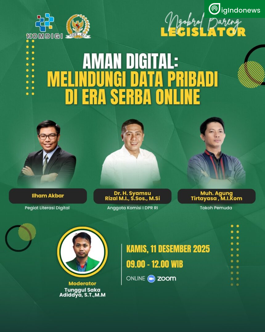 DigIndonews.com, Jakarta Selatan — Di tengah derasnya arus digitalisasi yang semakin menyatu dengan kehidupan sehari-hari, kesadaran akan keamanan data pribadi menjadi kebutuhan mendesak. Menjawab tantangan tersebut, Badan Pengembangan Sumber Daya Manusia Komunikasi dan Digital (BPSDM Komdigi) kembali menggelar webinar Ngobras Literasi Digital bertema “Aman Digital: Melindungi Data Pribadi di Era Serba Online”, Rabu, 11 Desember 2025, bertempat di Intel Studio Pasar Minggu, Jakarta Selatan.