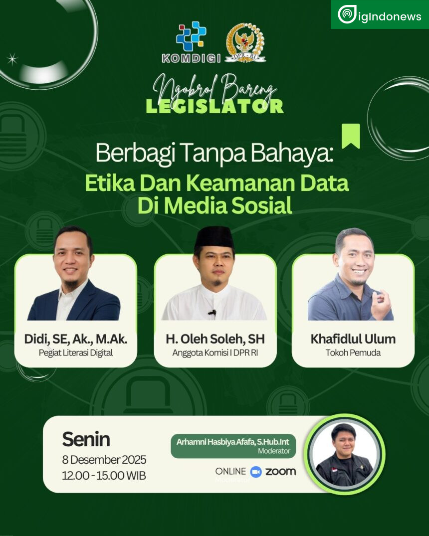 Digindonews.com, Jakarta — 8 Desember 2025. Badan Pengembangan Sumber Daya Manusia Komunikasi dan Digital bersama Anggota Komisi I DPR RI, H. Oleh Soleh, S.H, menyelenggarakan webinar literasi digital bertema “Berbagi Tanpa Bahaya: Etika dan Keamanan Data di Media Sosial” di Intel Studio Pasar Minggu, Jakarta Selatan. Kegiatan ini menjadi ruang edukasi publik mengenai meningkatnya risiko keamanan data pribadi serta pentingnya etika dalam bermedia sosial di tengah penetrasi digital yang terus berkembang.
