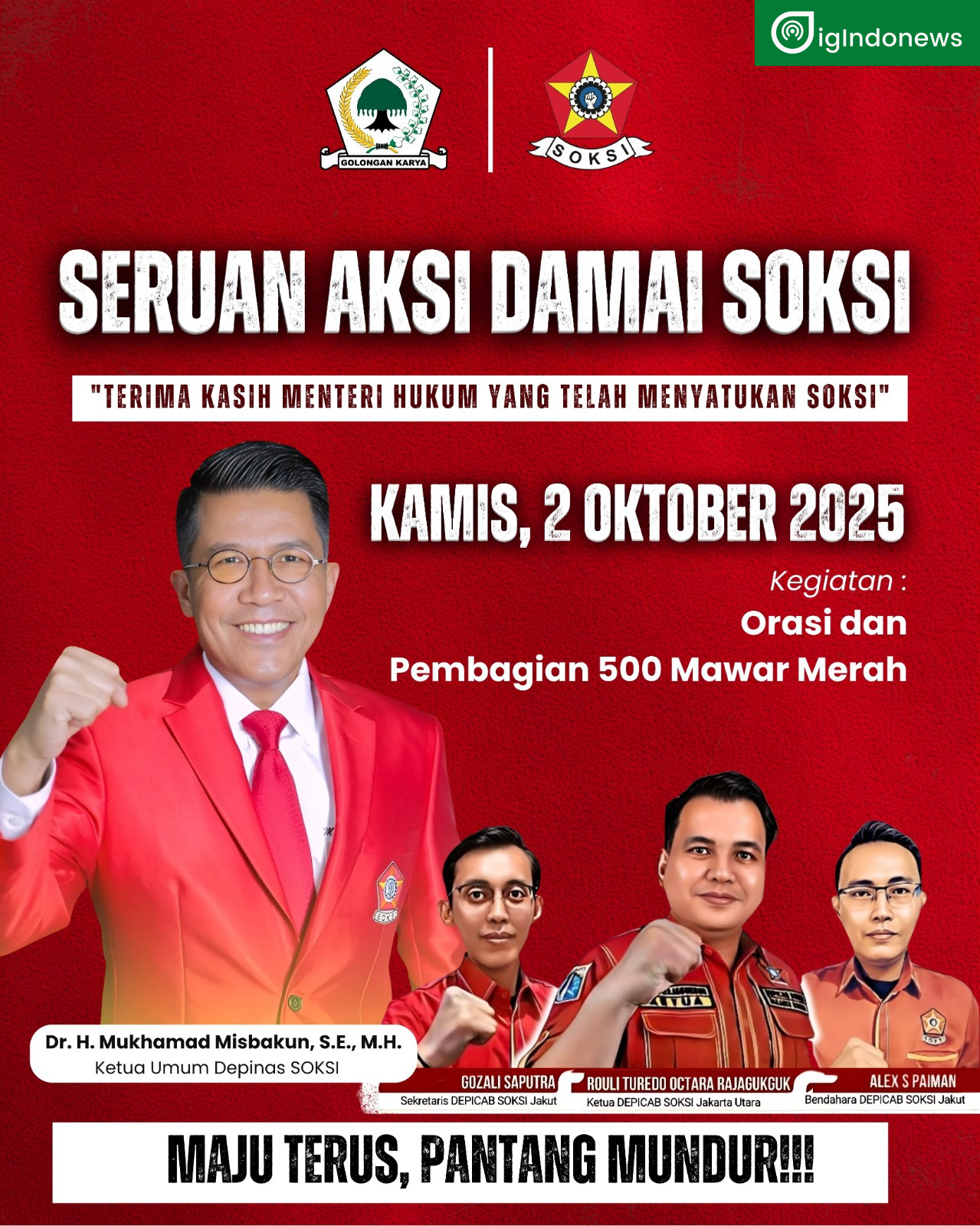 3. Dan sejak April 2025 Ketum Soksi Ir. Ali Wongso Sinaga dan jajaran sudah menggugat di Pengadilan Negeri Jakarta Selatan Larangan Penggunaan Nama Soksi kepada organisasi Depinas Soksi Pimpinan Misbakun dan jajaran dan saat masih proses sidang di Pengadilan Negeri Jakarta Selatan.