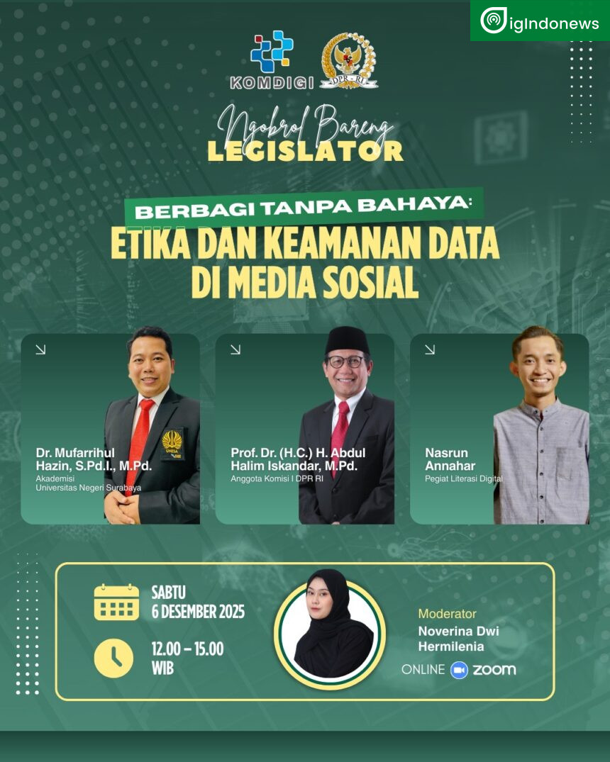 Perkembangan dunia digital yang semakin kompleks menjadi sorotan dalam webinar “Berbagi Tanpa Bahaya: Etika dan Keamanan Data di Media Sosial” yang diselenggarakan Badan Pengembangan SDM Komunikasi dan Digital bersama Anggota Komisi I DPR RI Prof. Dr. (H.C.) Abdul Halim Iskandar. Acara ini menghadirkan tiga pakar untuk membahas bagaimana masyarakat dapat terlindungi dari bahaya di ruang digital yang semakin tidak mudah diprediksi.
